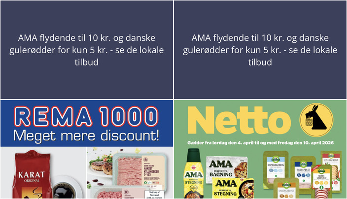 Netto tilbyder forskellige varianter af AMA Flydende, Bagning eller Stegning til en skarp pris på kun 10 kr. for 200-500 g eller 500 ml. Tilbuddet gælder fra lørdag den 4. april til fredag den 10. april.