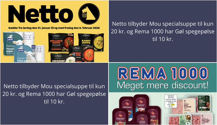 Vi har kigget på denne uges tilbudsaviser for dagligvarebutikker i Dyssegård og fundet nogle gode tilbud. Her er et udpluk af de bedste tilbud fra Netto og Rema 1000.